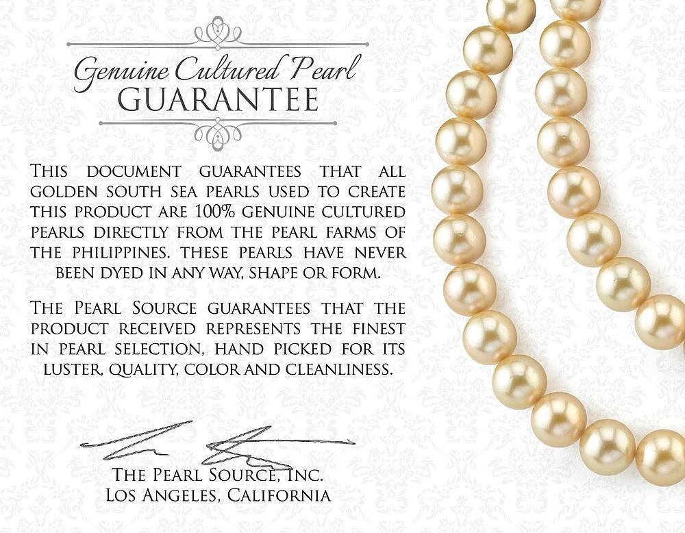 Naturally colored by its formation in the gold-lipped oyster, the South Sea Golden Pearl is said to bring wealth to the wearer. Golden South Sea pearls are among the rarest and most sought-after pearls in the world. They are also exceedingly difficult to produce, growing in only a few remote locations in Southeast Asia. The golden South Sea pearls in our golden south sea pearl necklace were grown in the warm, tropical waters off the coast of Palawan in the Philippines.